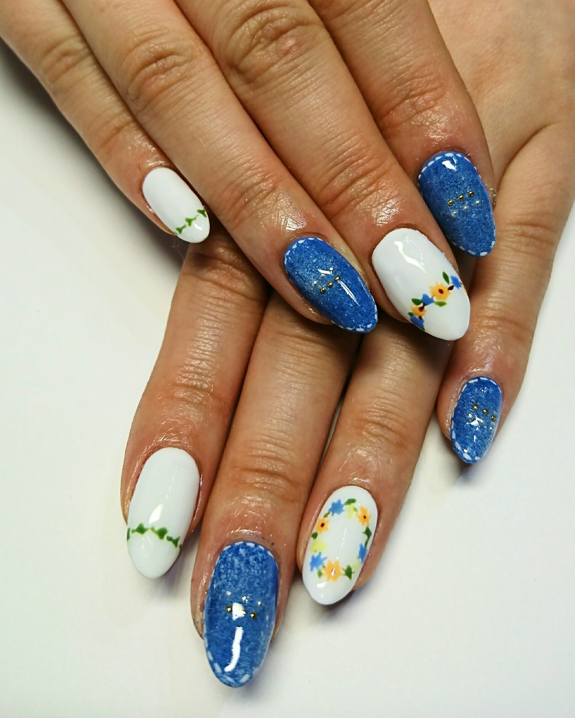 可愛らしいお花のイラスト×デニムネイルのカジュアルなデザインです☆