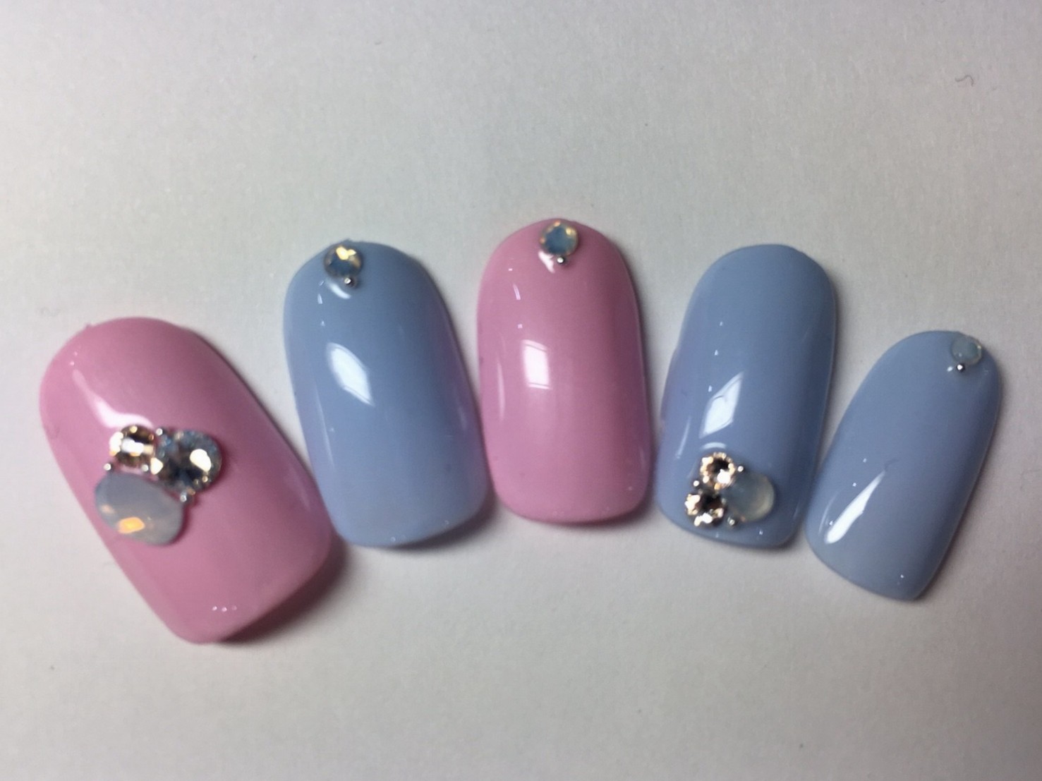 パステルカラーのシンプルなベースに控えめのビジューでエレガントに仕上げました☆