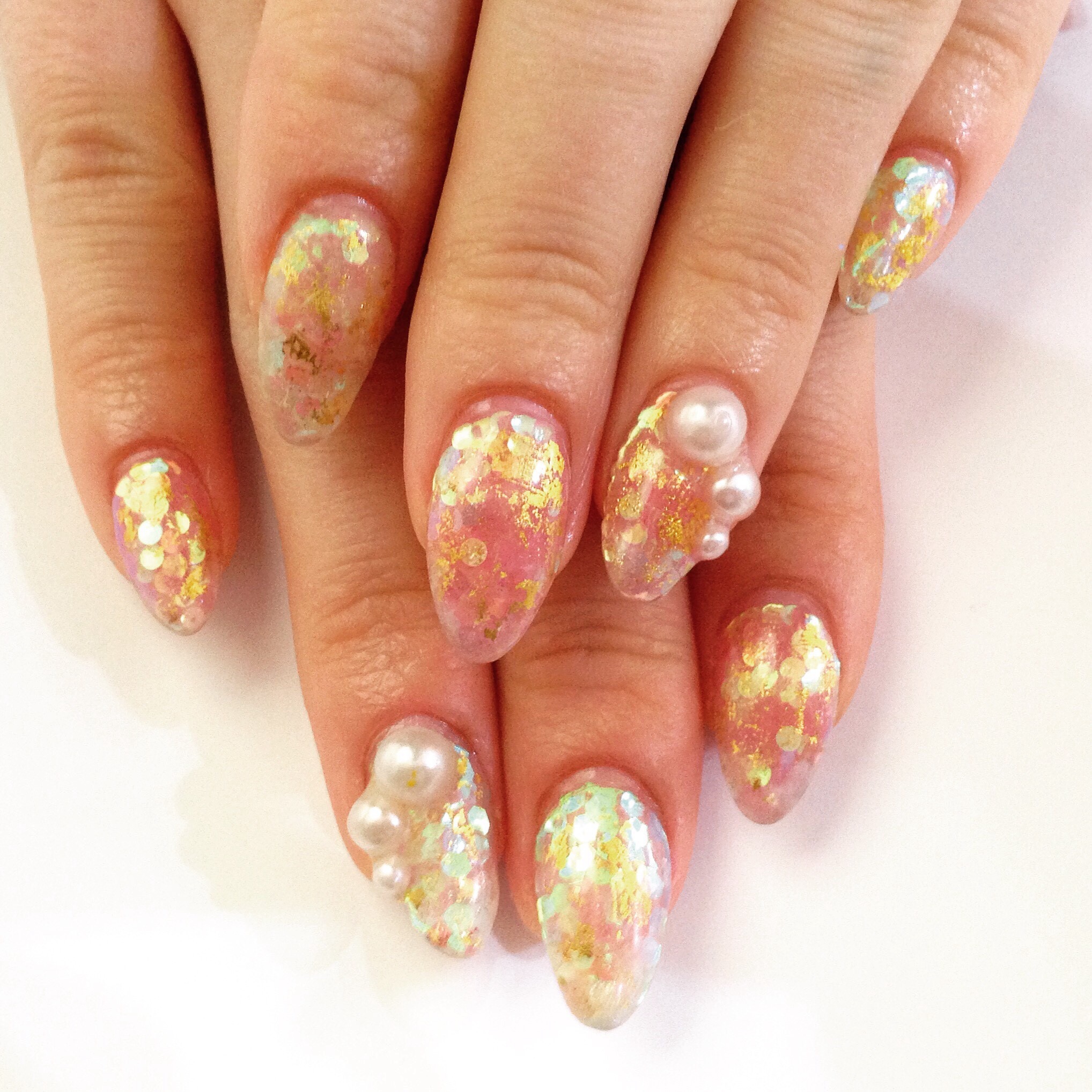 クリアベースのホイルネイルにパールをのせて清楚系に☆