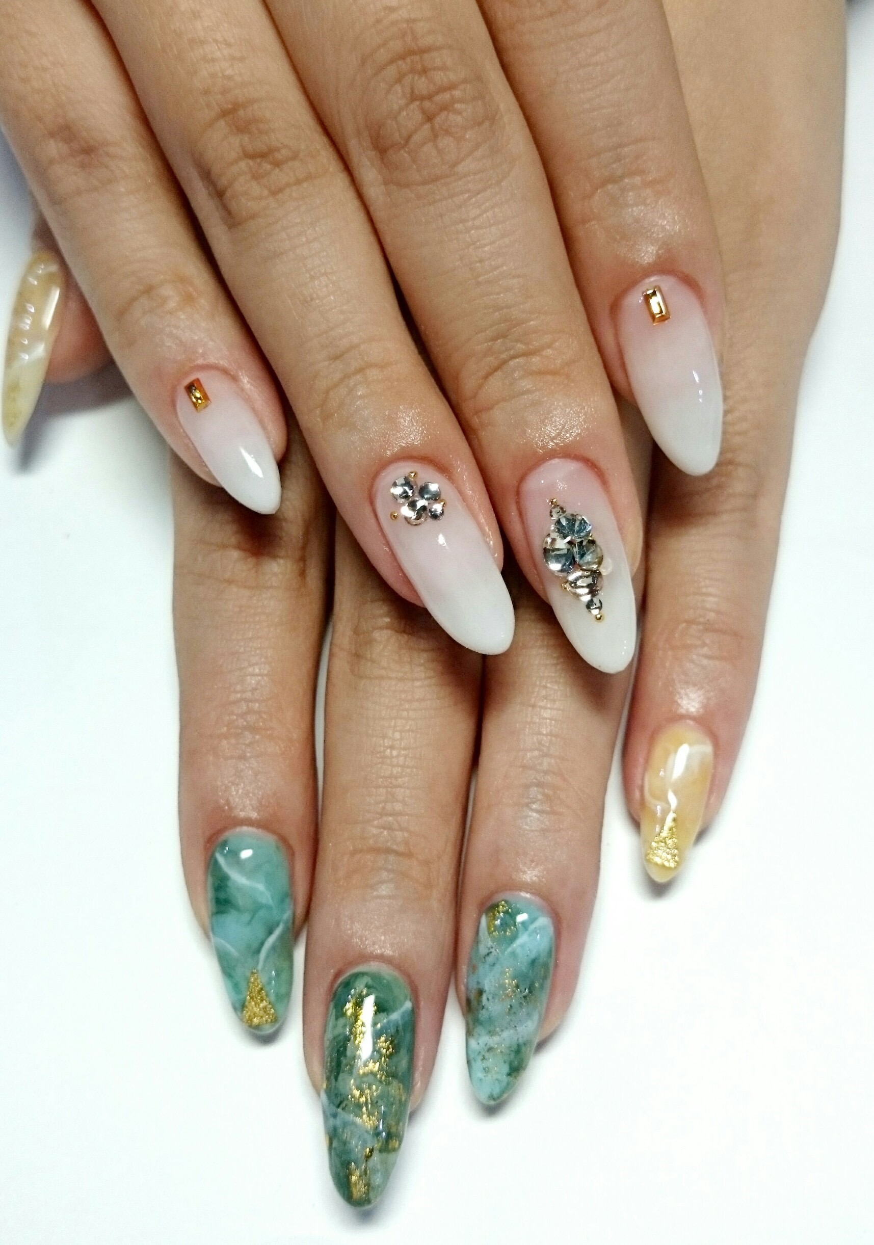 シンプルなストーンアートと、二色の天然石×ホイルネイルです☆
