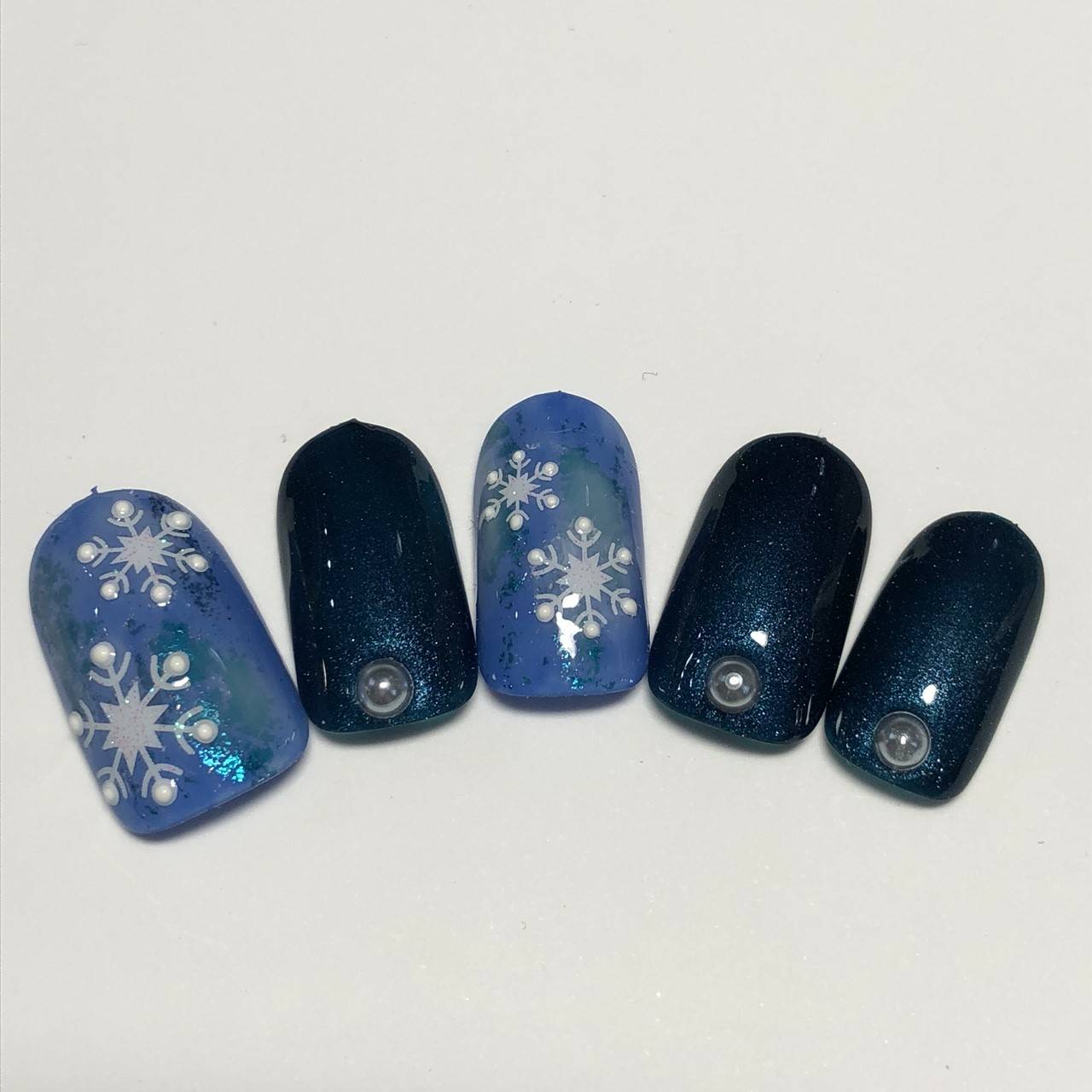 シックなブルー系をベースにした雪の結晶のクリスマスネイルです☆