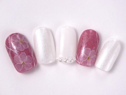 淡い花柄と純白のパールが上品でかわいいネイルデザインです☆