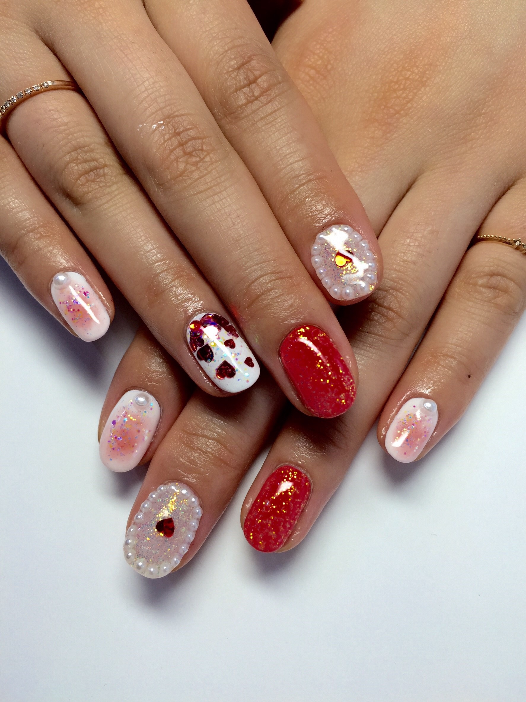 パールの囲みネイルと人気のハート型ホログラムで女子力UP☆
